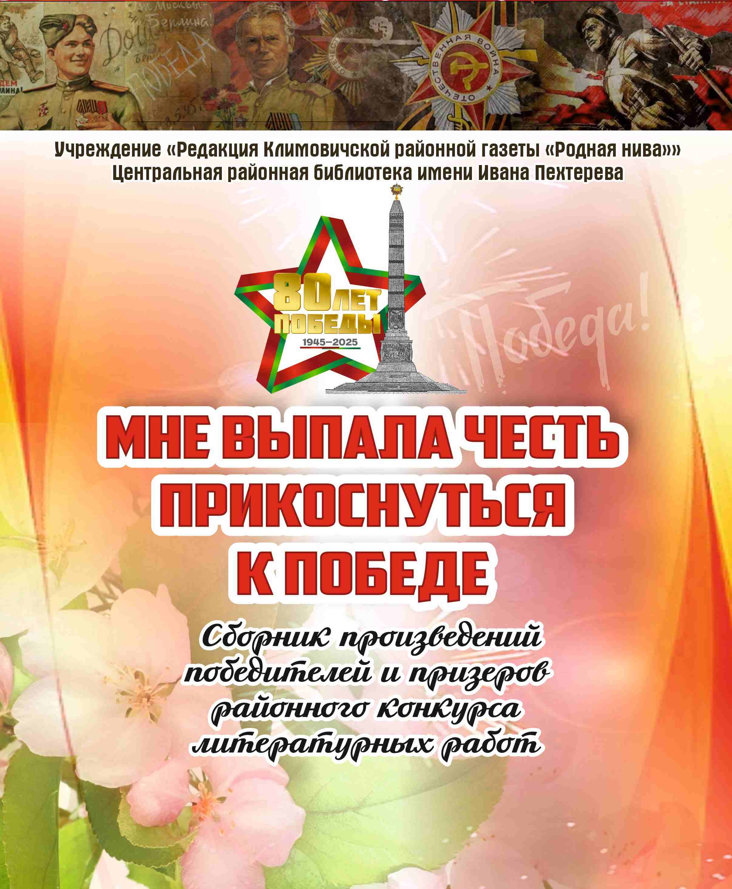 Мне выпала честь прикоснуться к Победе : сборник произведений победителей и призеров районного конкурса литературных работ / государственное учреждение культуры "Климовичская библиотечная сеть", центральная районная библиотека имени Ивана Пехтерева ; [составитель Ю.М.Клименкова ; редактор Т.П.Доменикан]. – Климовичи, 2025. – 28 с.